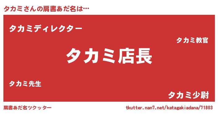 | 男性向けラノベタイトル風あだ名 | 『タカミの憂鬱』『魔弾の王とタカミ』 |