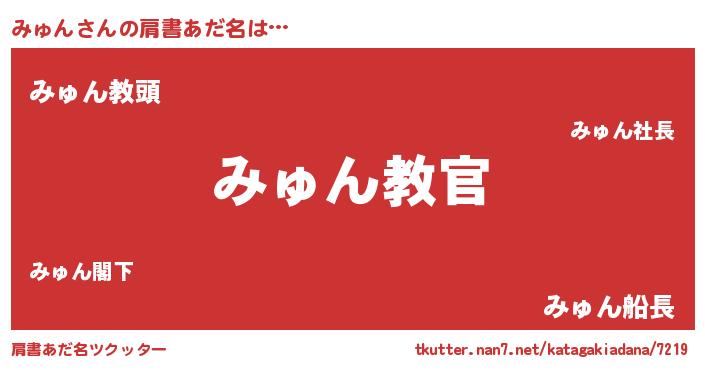 | 男性向けラノベタイトル風あだ名 | 『魔弾の王とみゅん』『みゅんの憂鬱』 |