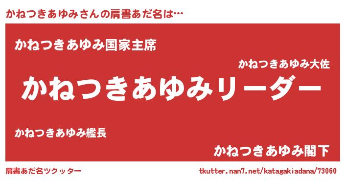 | 男性向けラノベタイトル風あだ名 | 『かねつきあゆみの嫁は女の子じゃないと思った?』 |