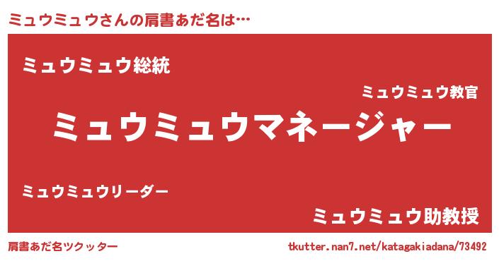 | 男性向けラノベタイトル風あだ名 | 『ミュウミュウに滅ぼされるだけの簡単なお仕事です』 |