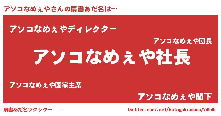 | 男性向けラノベタイトル風あだ名 | 『アソコなめぇやの憂鬱』 |