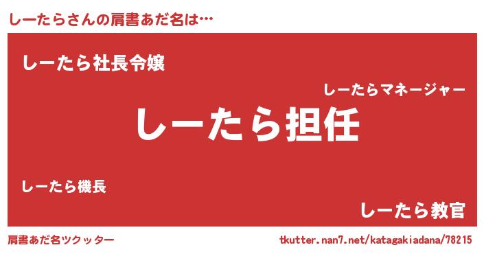 | 男性向けラノベタイトル風あだ名 | 『しーたらという概念が存在しない退屈な世界 』 |