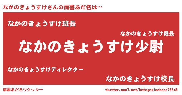 | 男性向けラノベタイトル風あだ名 | 『なかのきょうすけ~年齢イコール彼女いない歴の魔法使い~』 |