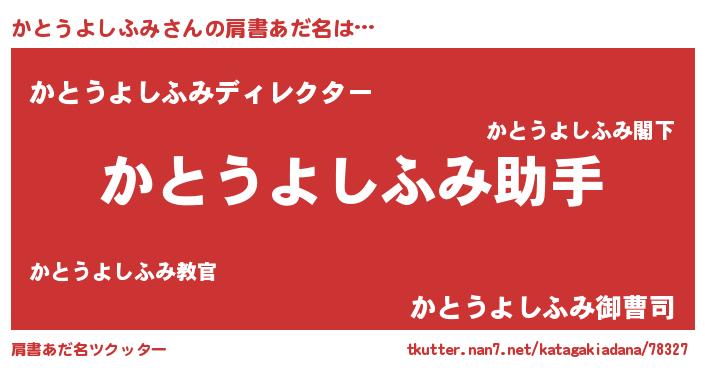 | 男性向けラノベタイトル風あだ名 | 『ノーゲーム・ノーカトウヨシフミ』 |
