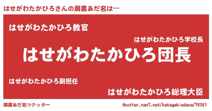 | 男性向けラノベタイトル風あだ名 | 『ダンジョンにはせがわたかひろを求めるのは間違っているだろうか』 |