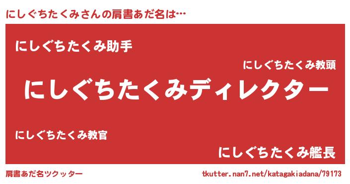 | 男性向けラノベタイトル風あだ名 | 『はたらくにしぐちたくみさま!』 |