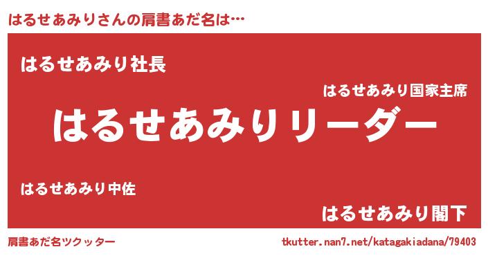 | 意味不明あだ名 | 『とにかく怪しいはるせあみり』 |