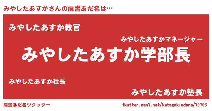 | 男性向けラノベタイトル風あだ名 | 『おまえをオタクにしてやるから、俺をみやしたあすかにしてくれ! 』 |