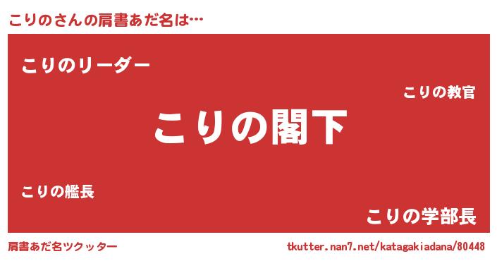 | 男性向けラノベタイトル風あだ名 | 『Re:こりのから始める異世界生活』 |