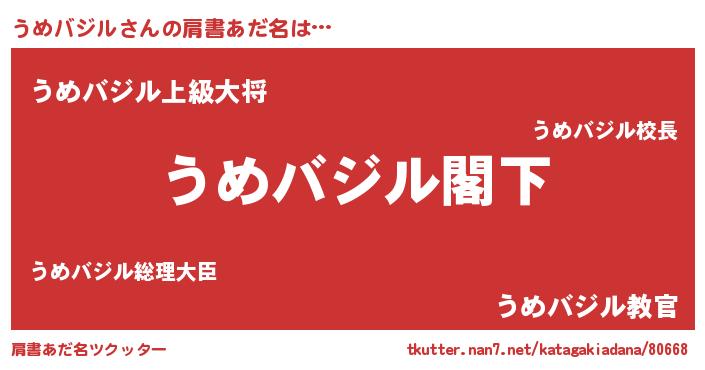 | 男性向けラノベタイトル風あだ名 | 『Re:うめバジルから始める異世界生活』 |