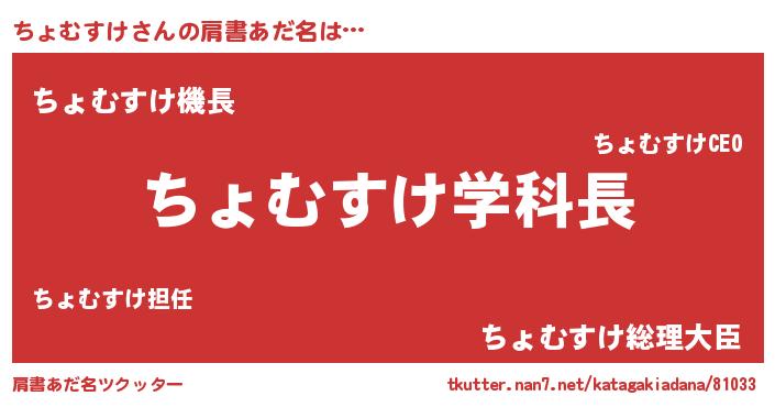 | 男性向けラノベタイトル風あだ名 | 『おまえをオタクにしてやるから、俺をちょむすけにしてくれ! 』 |