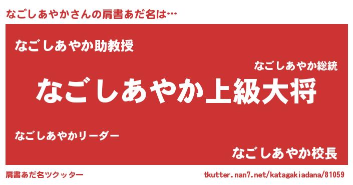 | 男性向けラノベタイトル風あだ名 | 『なごしあやか~年齢イコール彼女いない歴の魔法使い~』 |