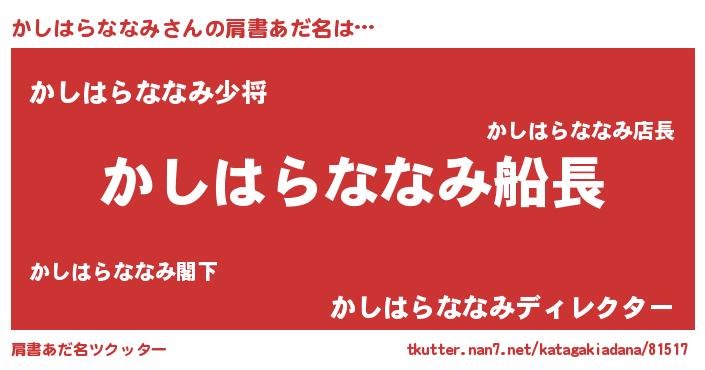 | 胡散臭い通販商品みたいなあだ名 | 『必ず成功するブレスレット…その名も「かしはらななみ」』 |