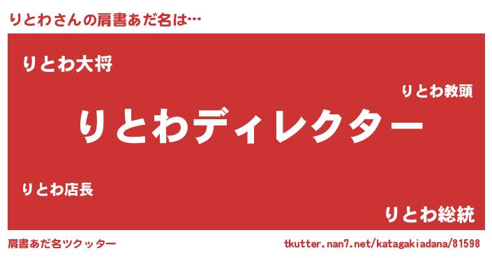 | 男性向けラノベタイトル風あだ名 | 『はたらくりとわさま!』『りとわの憂鬱』 |