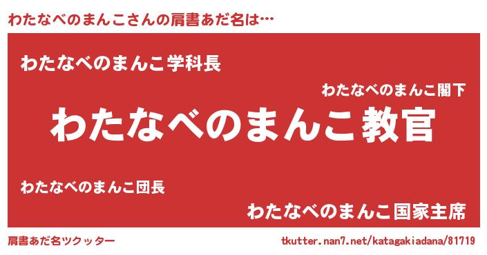 女子向けラノベタイトル風あだ名 | 『乙女ゲームの破滅フラグしかない悪役わたなべのまんこに転生してしまった…』 |