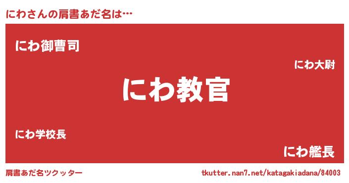 | 男性向けラノベタイトル風あだ名 | 『この素晴らしい世界ににわを!』 |