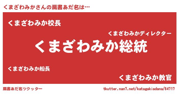 | 男性向けラノベタイトル風あだ名 | 『Re:くまざわみかから始める異世界生活』 |