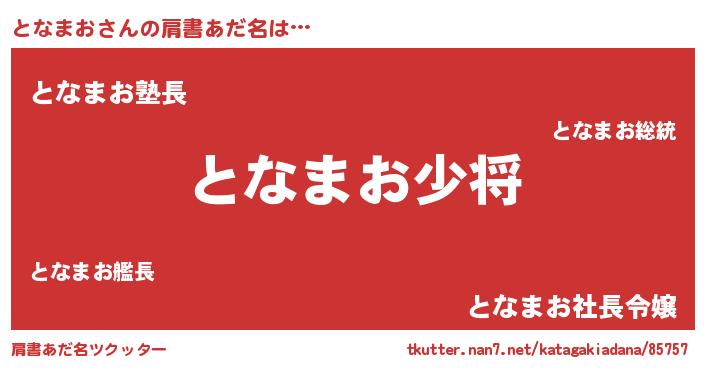 | 男性向けラノベタイトル風あだ名 | 『転生したらとなまおだった件』 |