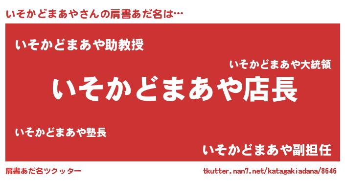 | ヘコむあだ名 | 『いそにゅー』『いそかどまあや(笑)』 |