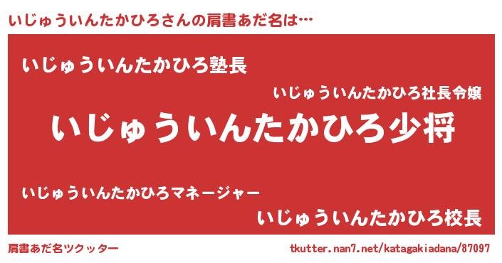 | 男性向けラノベタイトル風あだ名 | 『いじゅういんたかひろ~年齢イコール彼女いない歴の魔法使い~』 |
