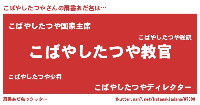 | 男性向けラノベタイトル風あだ名 | 『この素晴らしい世界にこばやしたつやを!』 |