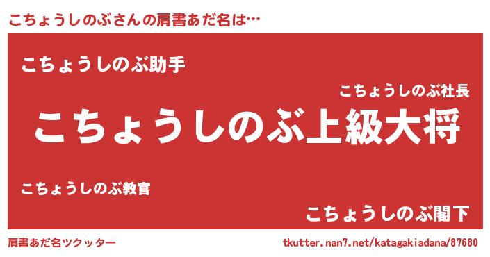 | 女子向けラノベタイトル風あだ名 | 『こちょうしのぶの玉の輿計画!』 |