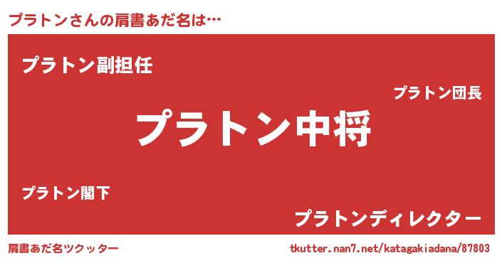 | 男性向けラノベタイトル風あだ名 | 『プラトン~年齢イコール彼女いない歴の魔法使い~』 |