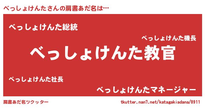 | 男性向けラノベタイトル風あだ名 | 『この素晴らしい世界にべっしょけんたを!』 |
