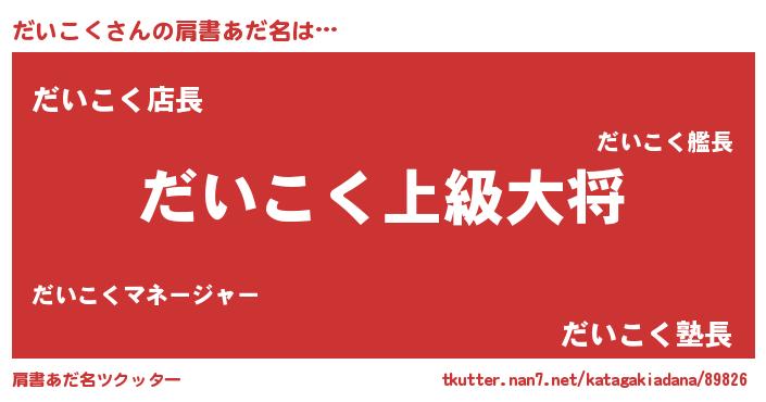 | 男性向けラノベタイトル風あだ名 | 『だいこく~年齢イコール彼女いない歴の魔法使い~』 |