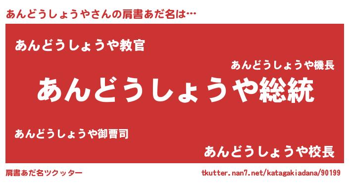 | 男性向けラノベタイトル風あだ名 | 『Re:あんどうしょうやから始める異世界生活』 |