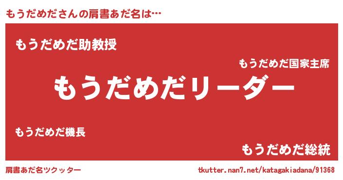 | 男性向けラノベタイトル風あだ名 | 『ダンジョンにもうだめだを求めるのは間違っているだろうか』 |