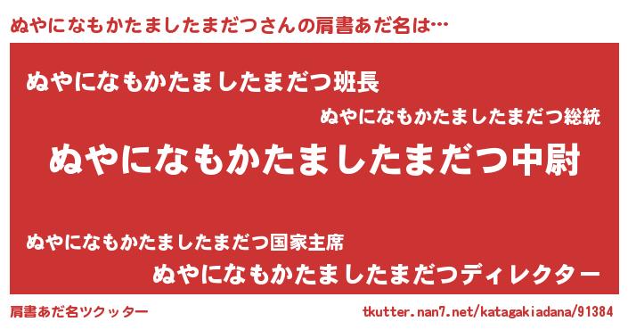 | 男性向けラノベタイトル風あだ名 | 『ヌヤニナモカタマシタマダツスレイヤー』 |