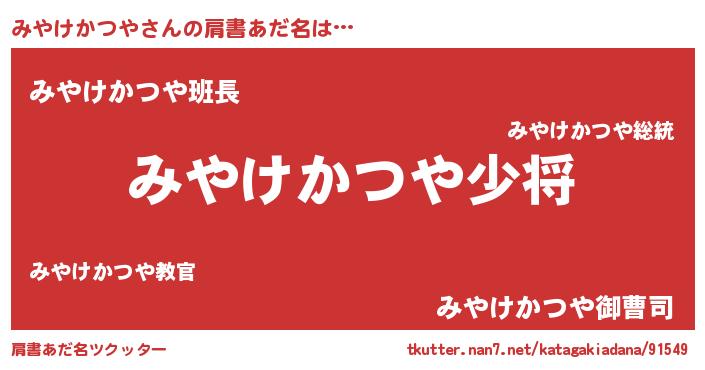 | 男性向けラノベタイトル風あだ名 | 『みやけかつや~年齢イコール彼女いない歴の魔法使い~』 |