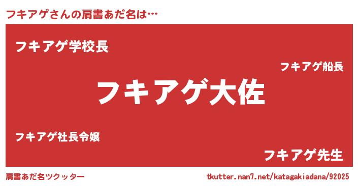 | 男性向けラノベタイトル風あだ名 | 『フキアゲ~年齢イコール彼女いない歴の魔法使い~』 |