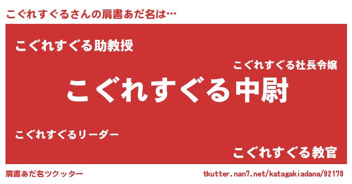 | 男性向けラノベタイトル風あだ名 | 『こぐれすぐる~年齢イコール彼女いない歴の魔法使い~』 |