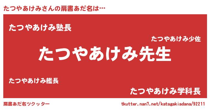 | 女子向けラノベタイトル風あだ名 | 『異世界で失敗しない100のたつやあけみ』 |