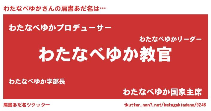 | 男性向けラノベタイトル風あだ名 | 『この素晴らしい世界にわたなべゆかを!』 |