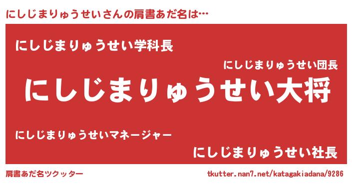 | 男性向けラノベタイトル風あだ名 | 『転生したらにしじまりゅうせいだった件』 |