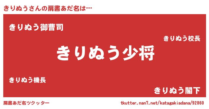 | 男性向けラノベタイトル風あだ名 | 『キリヌウスレイヤー』『きりぬうの憂鬱』 |