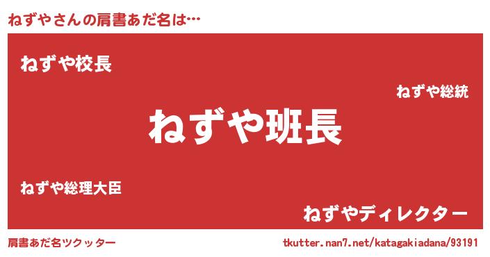 | 女子向けラノベタイトル風あだ名 | 『ねずや様がみてる』『ねずや伯爵の花嫁』 |