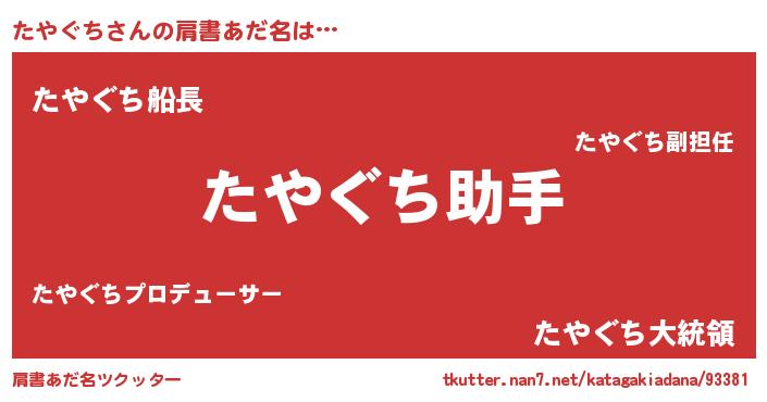 | ヒーロー風カッコイイあだ名 | 『天空の使者たやぐち』『ネオタヤグチ』 |
