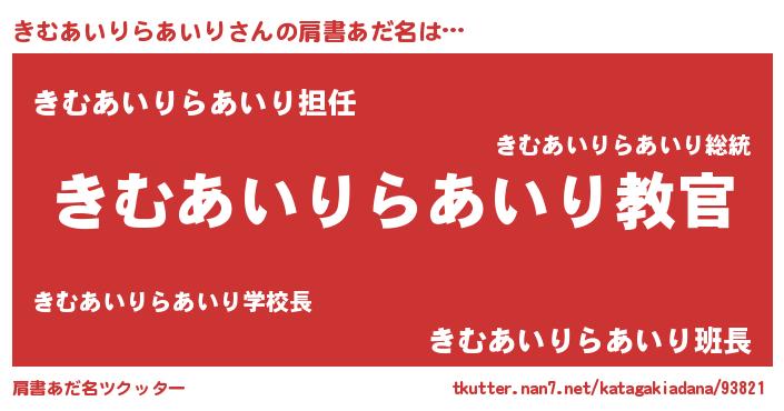 | 男性向けラノベタイトル風あだ名 | 『魔弾の王ときむあいりらあいり』 |