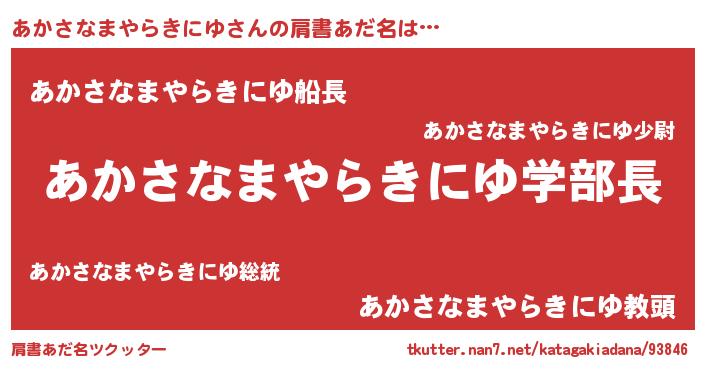 | 男性向けラノベタイトル風あだ名 | 『おまえをオタクにしてやるから、俺をあかさなまやらきにゆにしてくれ! 』 |