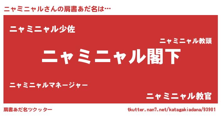 | 男性向けラノベタイトル風あだ名 | 『Re:ニャミニャルから始める異世界生活』 |