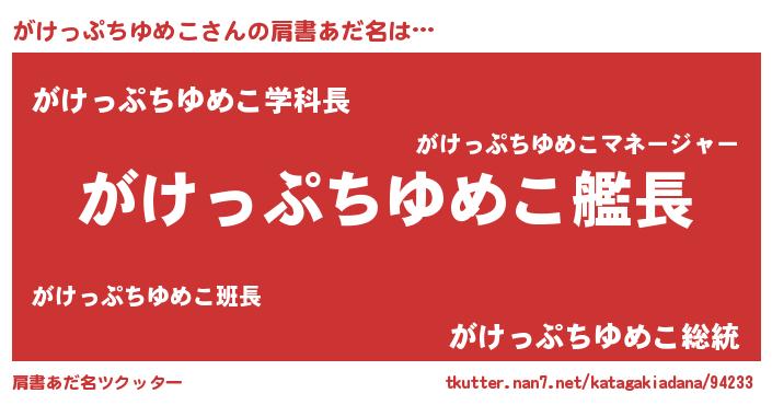 | 男性向けラノベタイトル風あだ名 | 『うちのがけっぷちゆめこが世界を掌握している!』 |