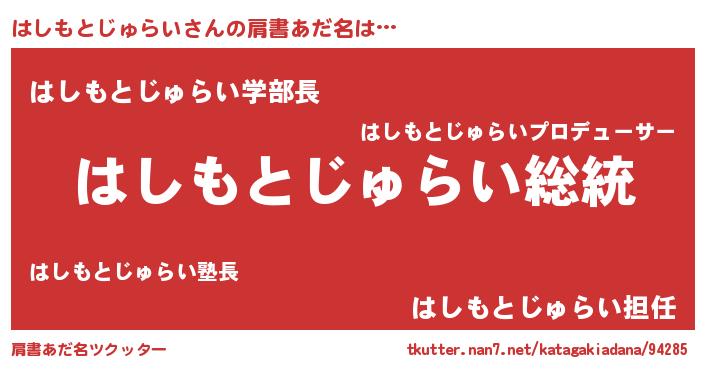 | ヘコむあだ名 | 『はしもとじゅらい(震え声)』『はしぷりん』 |