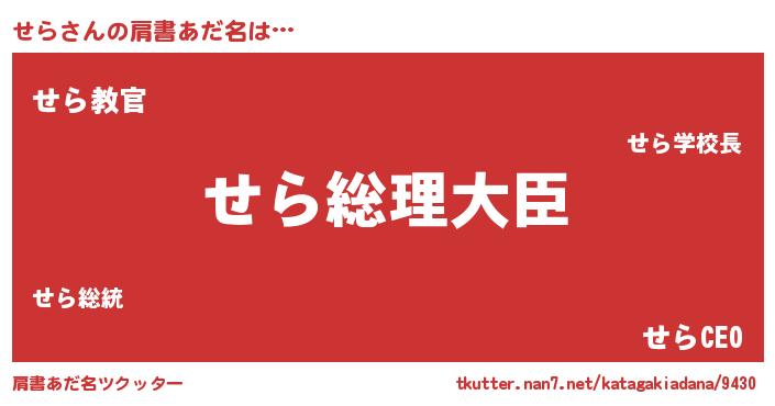 | 女子向けラノベタイトル風あだ名 | 『せらの雑貨屋さん』『死神せらの再婚』 |