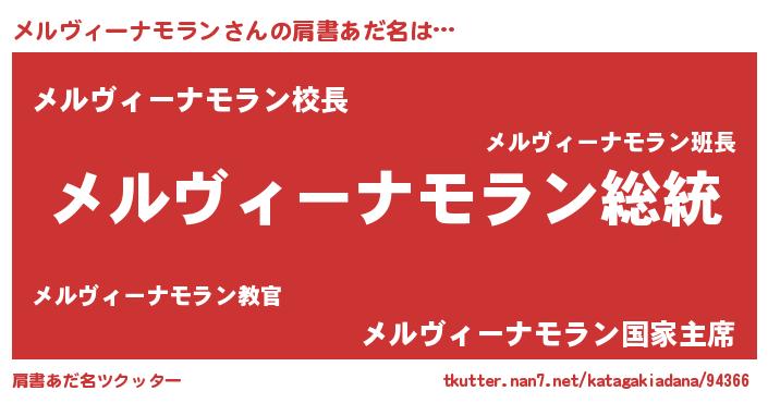 | 男性向けラノベタイトル風あだ名 | 『Re:メルヴィーナモランから始める異世界生活』 |