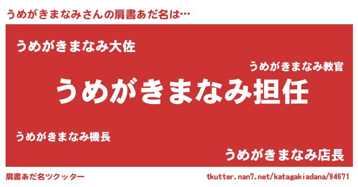 | 女子向けラノベタイトル風あだ名 | 『うめがきまなみの契約王妃』 |