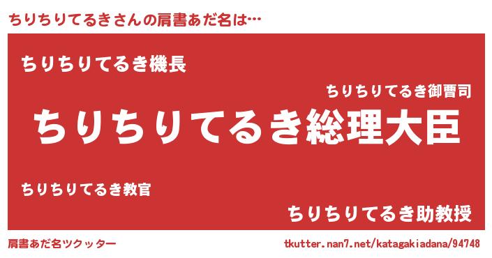 | 男性向けラノベタイトル風あだ名 | 『うちの娘の為ならば、俺はもしかしたらちりちりてるきも倒せるかもしれない。』 |